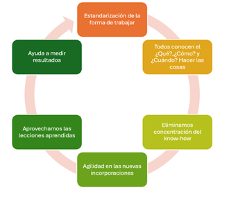 - Ayuda y garantiza que las personas sigan los mismos pasos en cada ocasión, lo que puede llevar a una mayor consistencia y calidad de los resultados (Estandarización del proceso)
